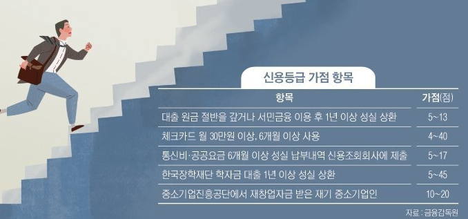 위 표로 자신의 신용등급이 몇 등급인지 알아볼 수 있다. 신용등급 및 신용평점은 개인의 신용 이력에 따라 변동하기 때문에 시간과 노력을 투자하여 개인의 신용 이력을 관리하면 충분히 향상시킬 수 있다. 그러나 시간이 소요되므로 꾸준한 경제생활을 하는것이 중요하겠다.